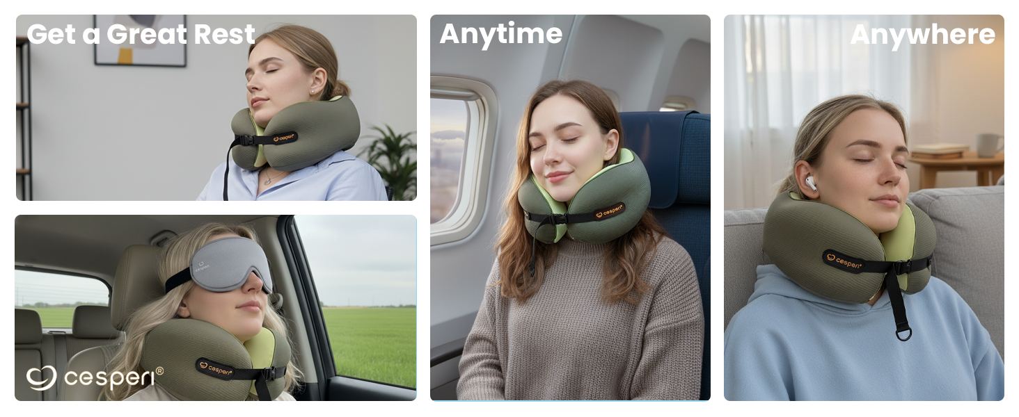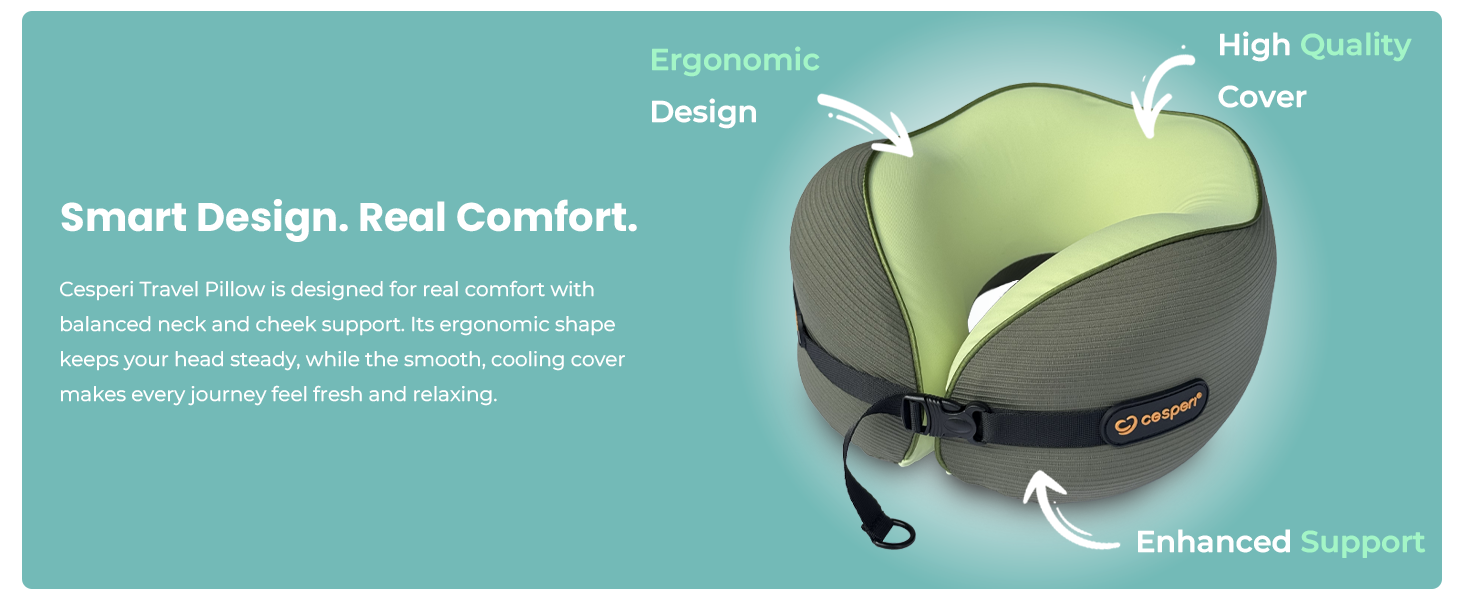 - Made with ideal memory foam density, the Cesperi travel pillow molds to your head and neck for outstanding support. The adjustable strap lets you customize the fit, ensuring secure, personalized comfort on every journey